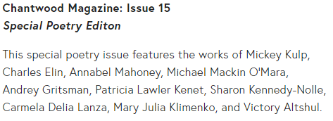 Chantwood Magazine Issue 15, the special poetry edition, is now available (see Kindle Newsstand link below).