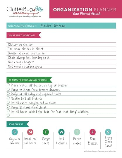 Here is my planner filled out for my master bedroom! Fill out your planner for each space in your home that you want to get organized and keep them all in a binder so you can track your progress. 15 minutes a day really will keep the clutter away.