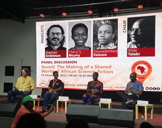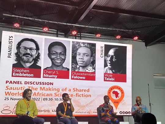 Stephen, Cheryl Ntumy, Wole Talabi and Dare Segun FalowoFour of us members of the Saúti Collective were invited to present the Sauútiverse at Ake Arts & Book Festival on Friday 25 November 2022. What a reception and great support from everyone in attendance and online!