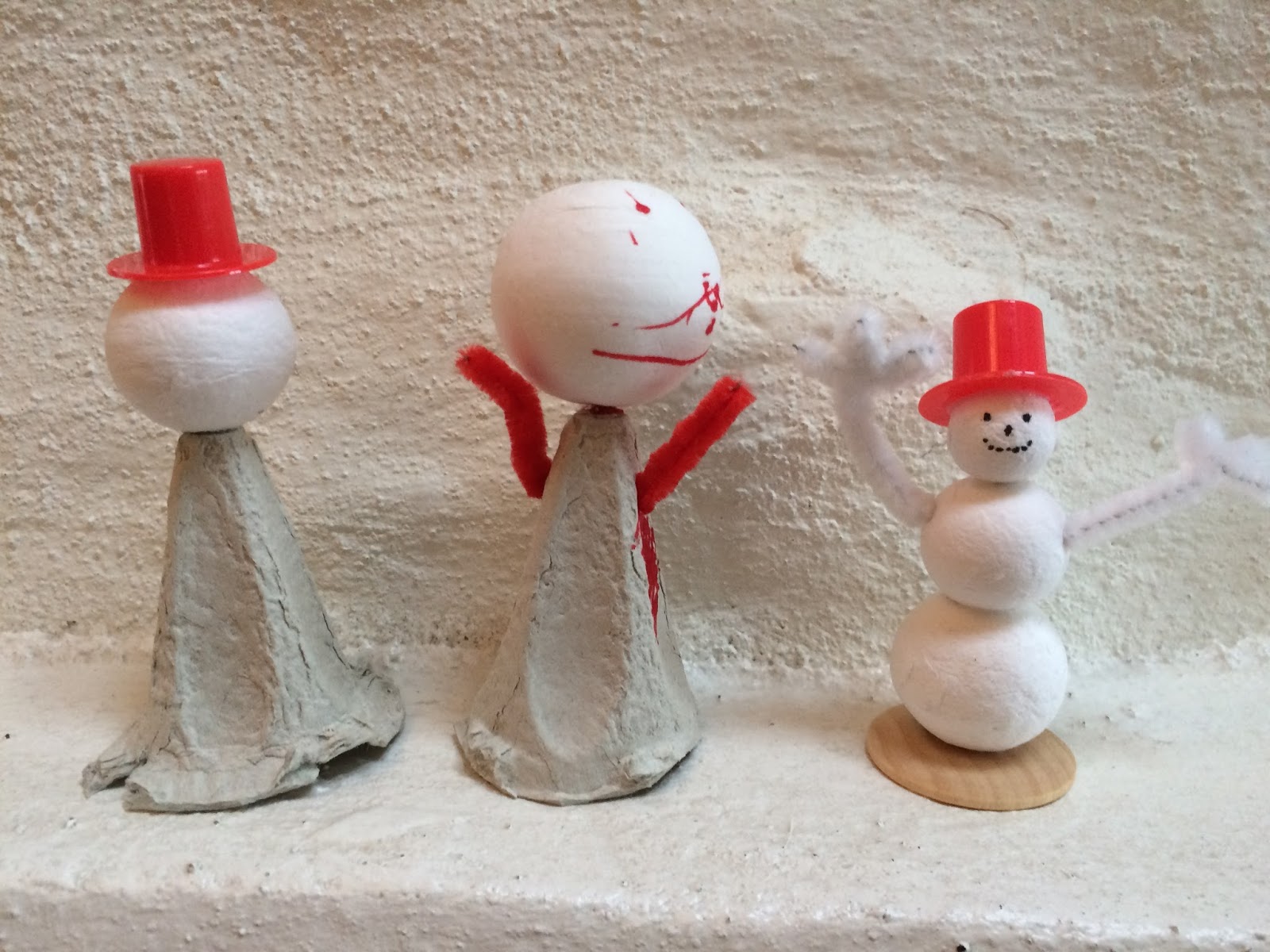 Ok, julivrande mamma där, allt ser trots vissa mer ohämmade inslag misstänkt tillrättalagt ut. Ditt barn då, fick hon någonsin fria händer? Nja, njo. Vi försökte göra tomtar och snögubbar en gång av sådana där äggkartongsgrejer och flörtkulor. Hon har klistrat på hatten på den vänstra figuren och ritat ansiktet på den i mitten. Gills det?