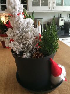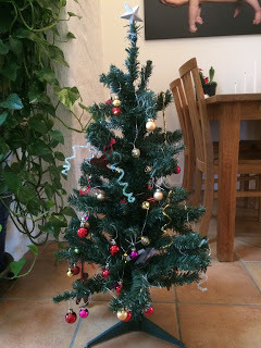 Redan förra året introducerade jag begreppet "förgran" här hemma, för att dottern skulle ha en chans att komma in i julstämning innan vi släpade in den äkta varan i vårt hem. Här har hon pyntat så fint. Notera enkla men trevliga hemmagjorda pyntsaker av glittriga piprensare (spiralerna man med lite god vilja kan urskilja). Jag lyckades till och med tillverka en toppstjärna av en trasig hängvariant. Här är förgranen, ca en meter hög och av finaste plast: