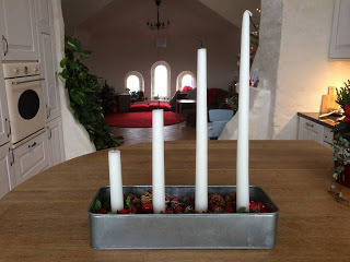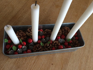 Och adventsljusstaken då? Jodå, i år valde jag en annan stil än förra årets krydd- och nötblandning. Den här gången jobbade vi i stället med kottar (både naturella och glittriga) samt små fejkäpplen och bär. Mossan som allt är nedtryckt i kan man inte ens ana. Hyfsat nöjd även med nedbrändhetssymmetrin på ljusen. Så här ser det ut: