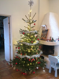Och här nedan har vi the real thing. Denna snarare två och en halv meter hög, även om de båda granarna förefaller ungefär lika höga på bilderna. Dottern har även klätt nedre delen av denna, samt introducerat det tjocka vulgoglittret som jag sedan fick ordna på ett så smakfullt sätt som möjligt. Hon insisterade också på stjärna i toppen, vilket jag annars inte brukar ha. Jag köpte tre olika innan jag hittade en som faktiskt gick att sätta fast utan att själva toppgrenen droopade betänkligt.
