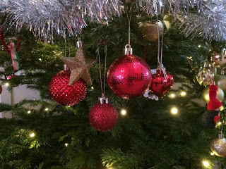 Här ser vi ett exempel på dotterns pyntstil. Det är liksom sporadiska kluster av granprydnader. Jag tycker faktiskt inte att det är så dumt. Det ser modernt ut.