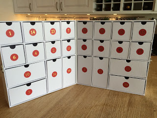 Kalender då, supermamma där? Självfallet en någotsånär hemmagjord variant med små presenter i. Ingen hejd liksom! Hittade en fin hopfällbar variant på Panduro: