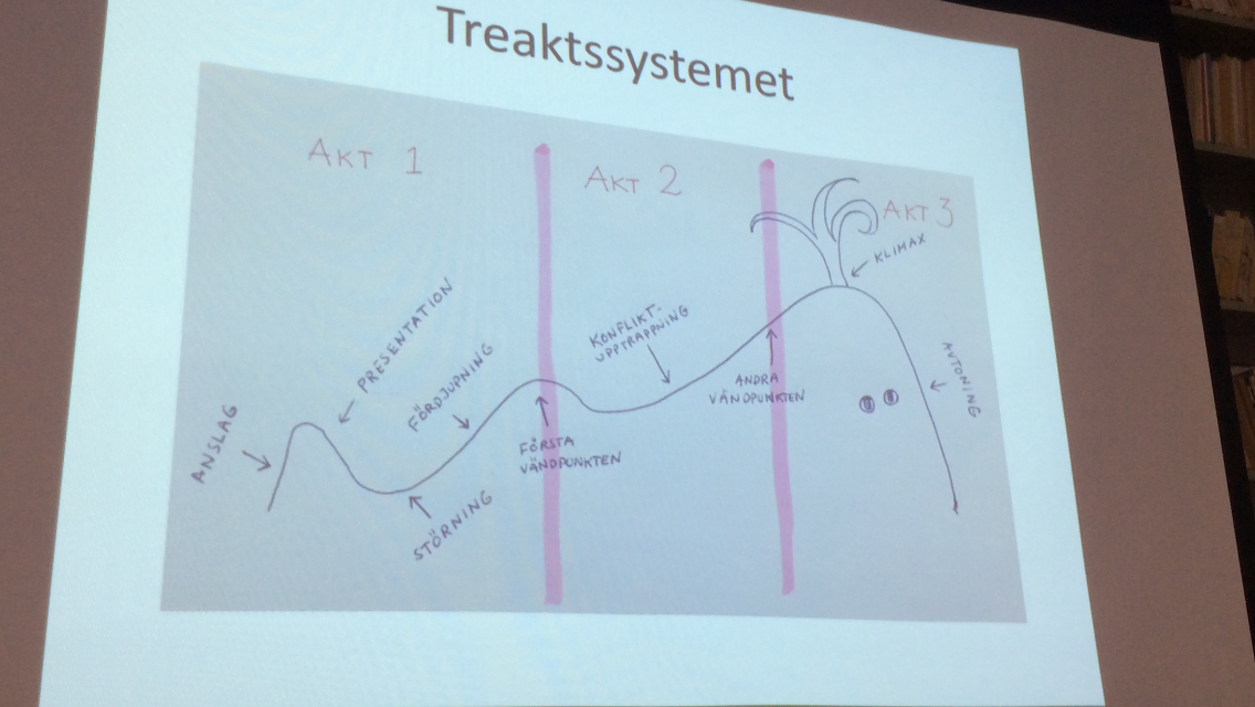 Treaktsvalen (Alex Haridi, från kursslidesen)Sedan delade han upp detta ytterligare i en akt 2a och akt 2b, så att vi fick fyra lika stora delar (jaha, tänker ni, varför kallar man det inte för "fyraktssystemet" rätt och slätt? Svar: Inte fan vet jag. Av gammal hävd, förmodar jag.):