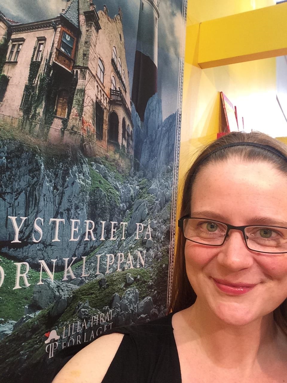 Jag strax nedanför mina böcker i Lilla Piratförlagets monter på bokmässanMen det där var ju inte så dumt! Två dagar bokmässa, torsdag-fredag. Jag hade det verkligen superkul och träffade en massa trevliga människor. Inte minst stötte jag på ett helt gäng av alla dem jag haft någon sorts kontakt med via sociala medier. Riktigt roligt!