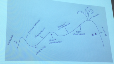 Klassisk dramaturgisk struktur - skelettversionen (Alex Haridi, från kurskompendiet)Han ritade även upp denna struktur i form av en något knölig "val":
