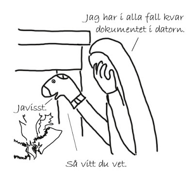 Jag har börjat skriva och rita en tecknad serie. Den handlar om en kvinna (jag) som fått en oönskad strumpdocka på handen.