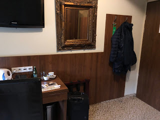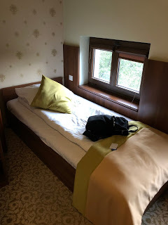 Jesus, liksom! Det var en skrubb! Med heltäckningsmatta och en ca 70 cm bred säng. Det luktade fuktigt också. Och minibaren var ekande tom och helt enkelt urkopplad. Annars hade jag möjligen tagit mig någonting stärkande och svindyrt därifrån.