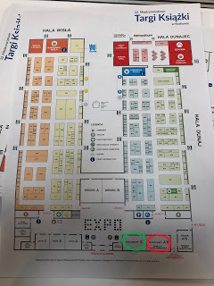 Karta över mässan (grön cirkel = greenroom där vi satt och väntade, röd cirkel = rummet där vi gjorde våra små framträdanden)Jag var först ut. Inte så dumt faktiskt. Jag tror att det kan ha varit ca 20 personer i publiken och det kändes helt ok, för rummet var inte speciellt stort. Självfallet började jag med att ursäkta mig för att jag inte talade polska, på polska: