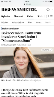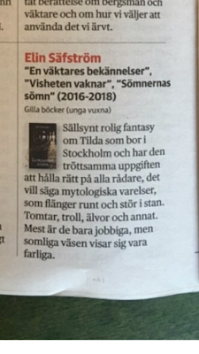 "Sällsynt rolig fantasy" (DN 2019-01-05)Att hamna i DN inte mindre än två gånger inom loppet av en månad är helt sjukt - sjukt otippat och sjukt rolig (förstås). Den här gången är det Lotta Olsson som tipsar om nordisk fantasy. Åtta andra författare och deras verk omnämndes, bl.a. "Vattnet drar"-trilogin av Madeleine Bäck, "Ättlingarna" av Mats Söderlund och "Idjärvi"-trilogin av Charlotte Cederlund.