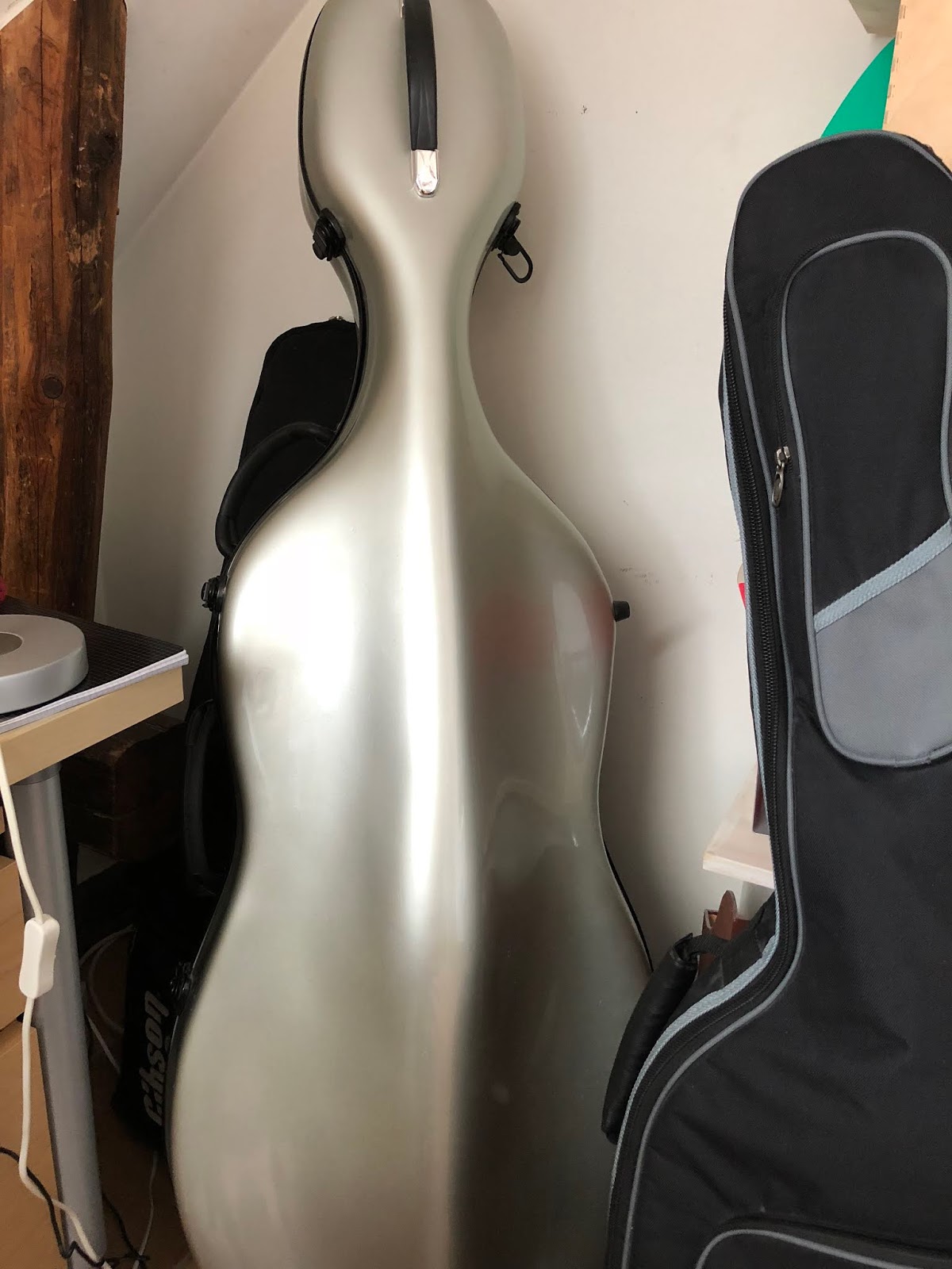 Cellon, snett bakom gitarrenDär har den stått i ett hörn och stirrat på mig med anklagande min. Jag har då och då gett den ett ursäktande leende och sedan gått vidare med mitt liv.