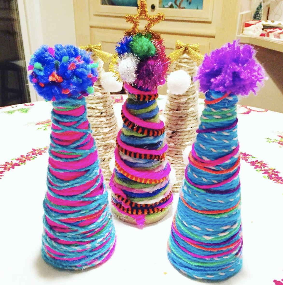 For our most recent craft night, we created these! So simple to make. We created them with cardboard cones left over from yarn, yarn bombed them and added details. I'm thinking I may have to create a how-to video of this and the pompoms this week so stay tuned.