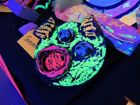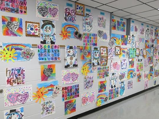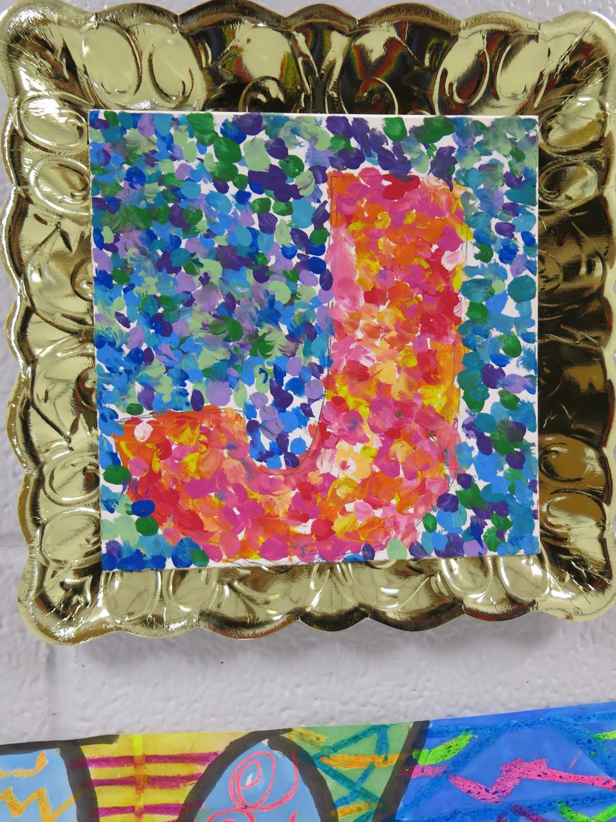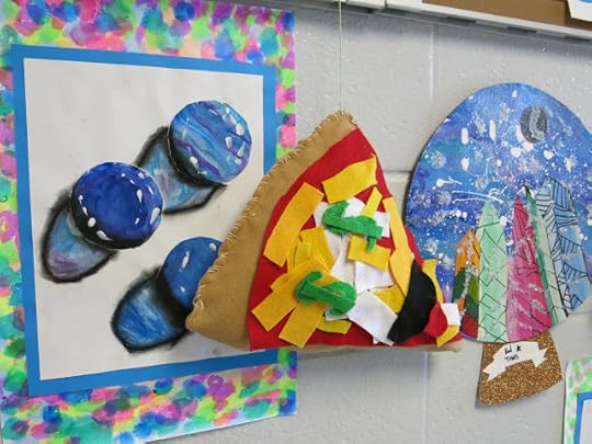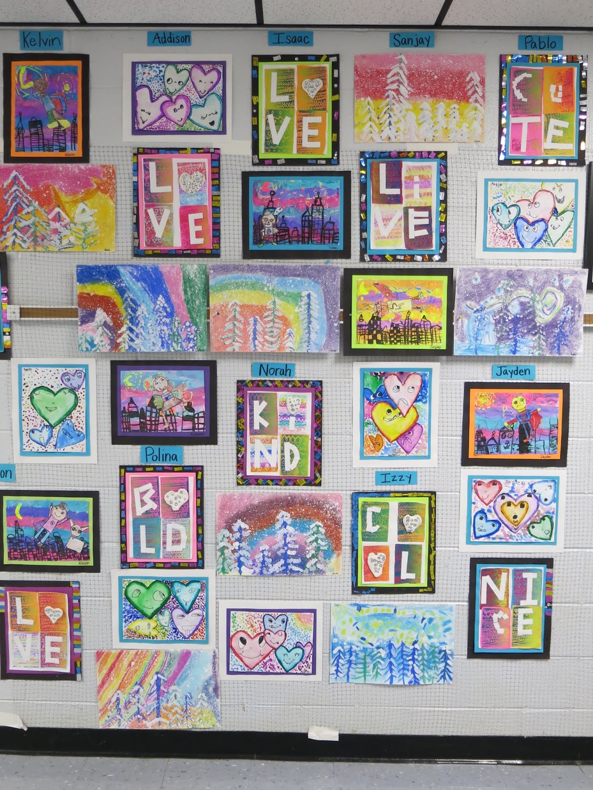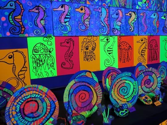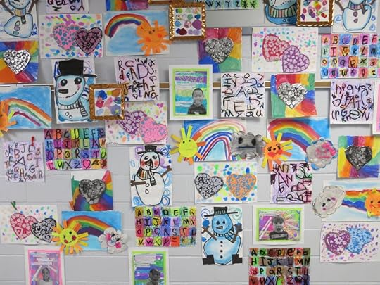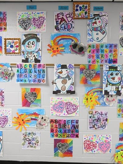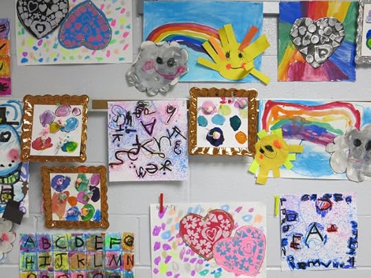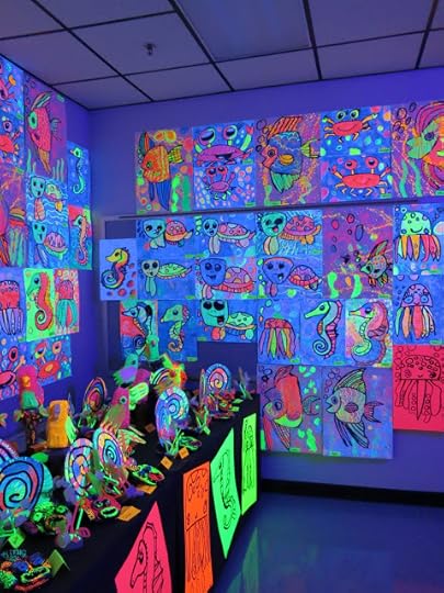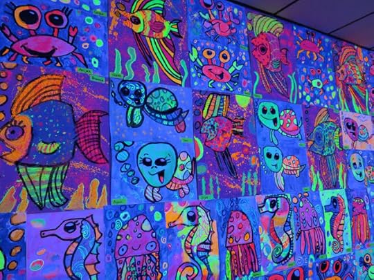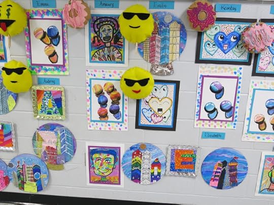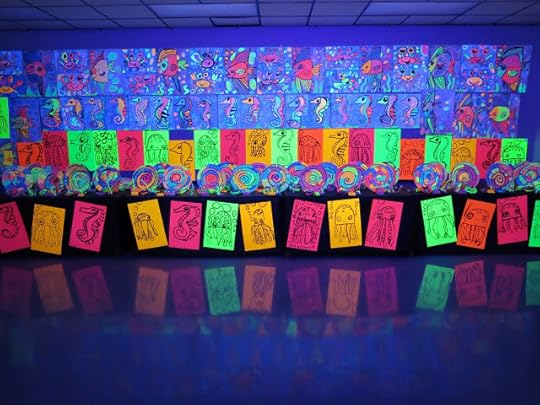 In a pinch, when time was running short, we did use fluorescent poster board and bingo daubers for some of the drawings. We did this because I only had one 30 minute art class with the kids before the big day...so we worked with the time we had. I wanted to insure that every kiddo had a work of art in this special room.