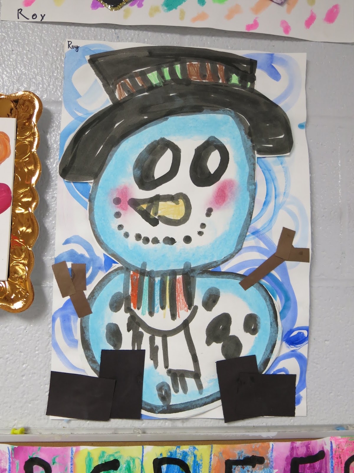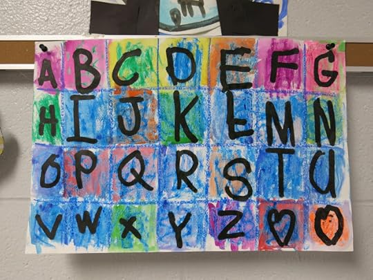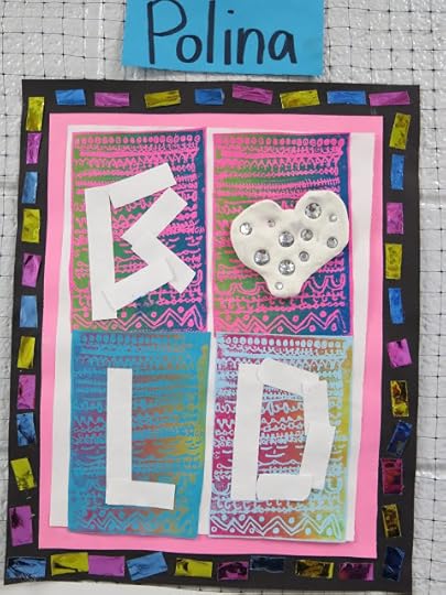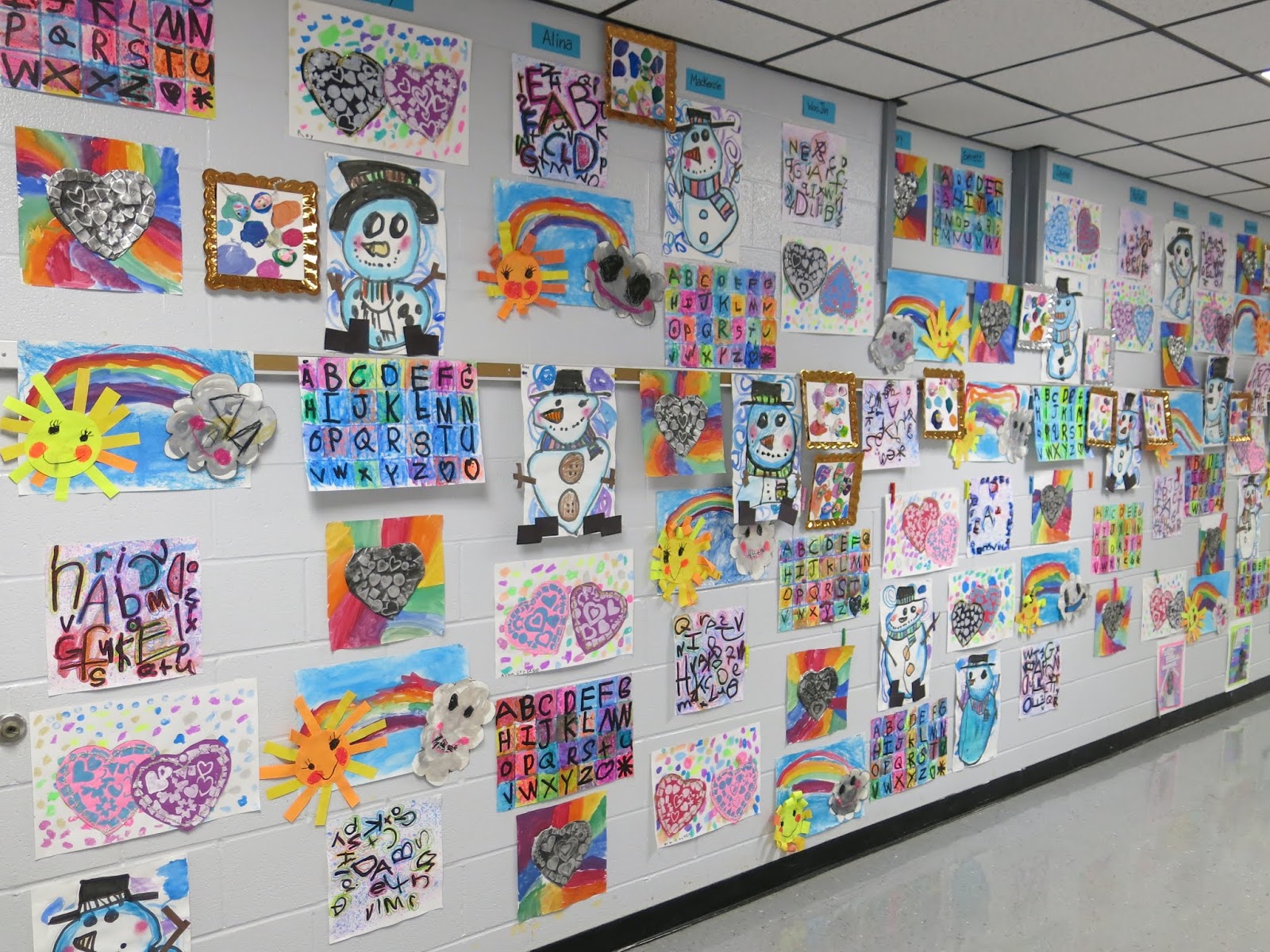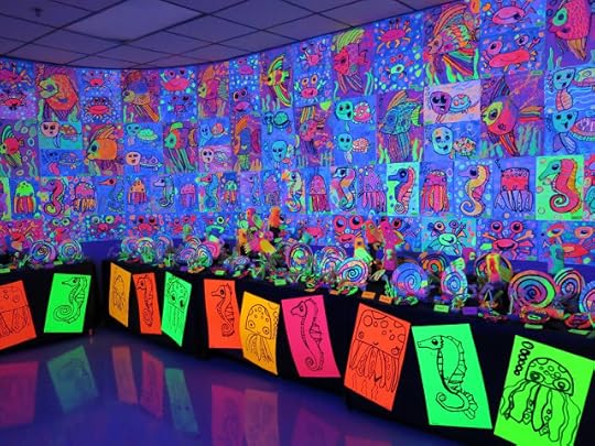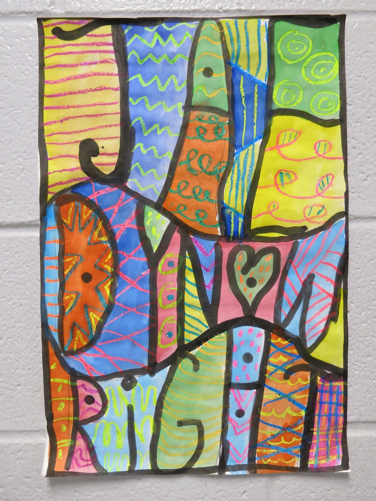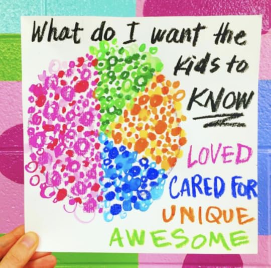 In a pinch, when time was running short, we did use fluorescent poster board and bingo daubers for some of the drawings. We did this because I only had one 30 minute art class with the kids before the big day...so we worked with the time we had. I wanted to insure that every kiddo had a work of art in this special room.