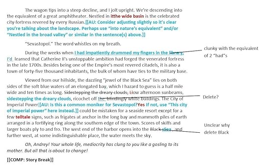 Below is a sample of a typical page after the eagle-eyed editors have combed through it for the 3rd time. You can understand why my eyes are crossed from overload and my fingers are crossed that every blunder has been fixed.