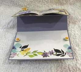 I added another piece of design paper from the Le Petit Jardin range to the inside as shown above. I added my main (foiled) image to the easel card in the appropriate place, then added matching flowers to allow the card to stand up. (See below)