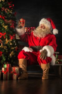 Santa Claus brought gifts for Christmas. Santa is placing gift boxes under Christmas tree