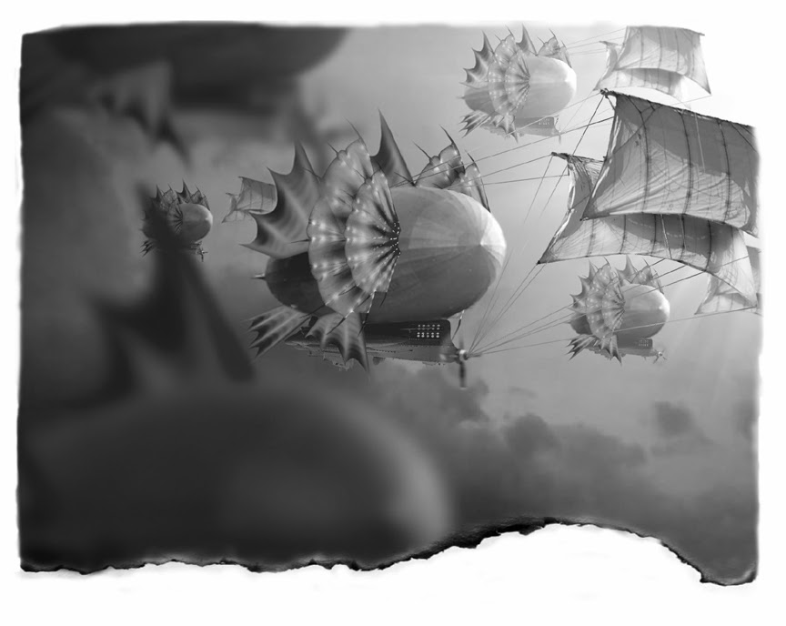 Vehicles have difficulties all their own. They have moving parts, their form follows their function. You have to believe that at one point somewhere, someone designed and fabricated and assembled this working, moving wonder of engineering. What are they made out of? What is their fuel source? How do they get from point A to B without crashing into a burning spectacle? Now, you can go too far with this thought process. This is fantasy after all. But it should have some basis and semblance of reality in order to transport the reader into your world. Using recognizable parts in an unusual way is a trick that you can use to not only make it believable, but interesting and fresh as well. I designed the Sky-Cleaver Airships below using fins from a lion fish for their side sails, and part of an old Soviet submarine for the galley below the balloon.