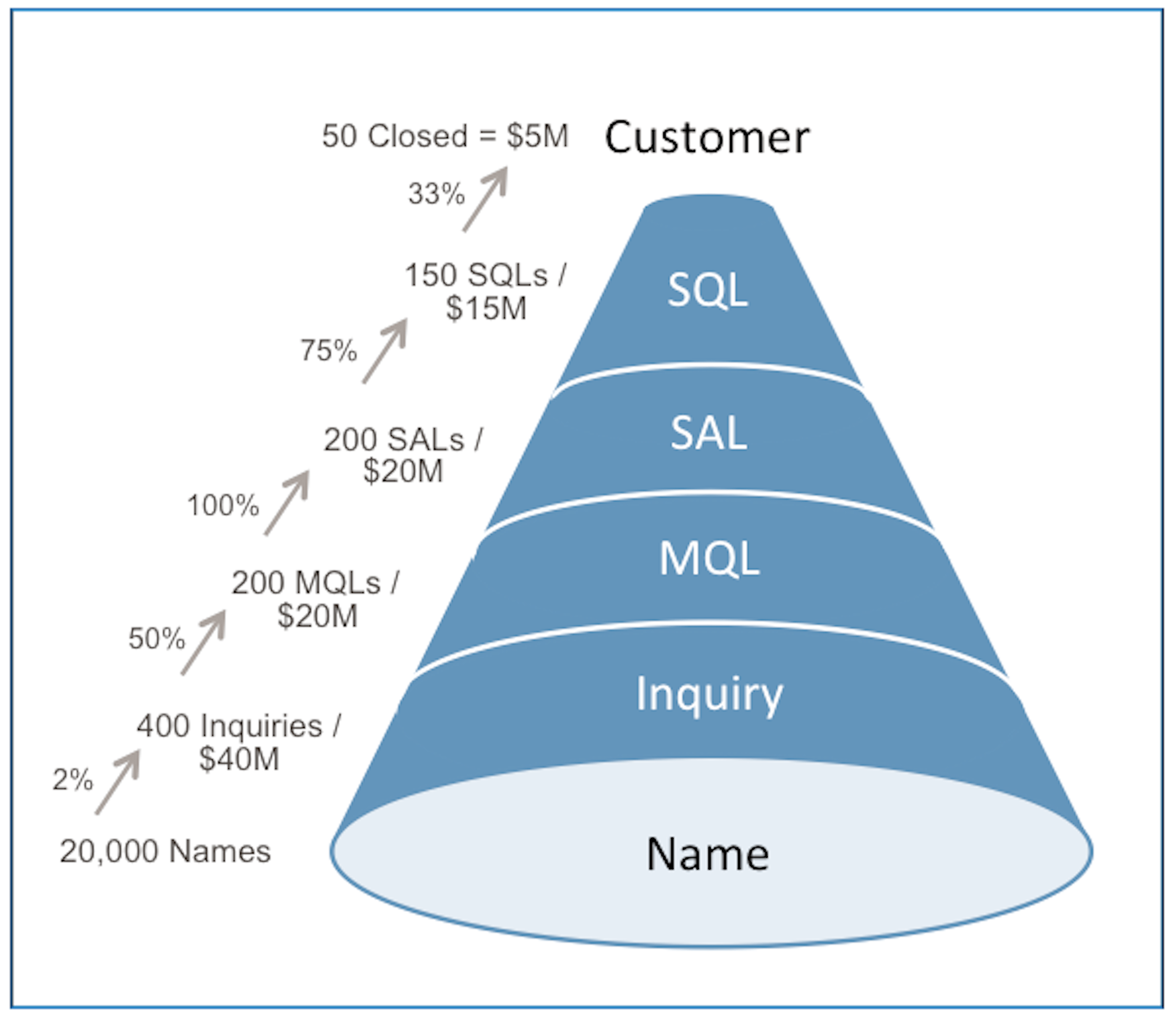 This funnel shows that to get 50 closed deals with $5 million in revenue, I need 150 SQLs, from 200 MQL, which come from 400 inquiries and 20,000. The numbers are all derived from working backwards from the 50 won deals, using known conversion rates.