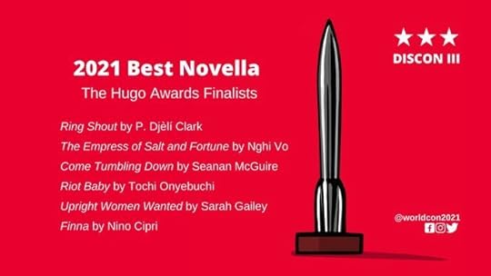Mejor novela cortaCome Tumbling Down, Seanan McGuireThe Empress of Salt and Fortune, Nghi VoFinna, Nino CipriRing Shout, P. Djèlí ClarkRiot Baby, Tochi OnyebuchiUpright Women Wanted, Sarah GaileyTriunfo absoluto de la editorial Tor en esta categoría, donde hay unas cuantas novedades más: por una parte, tenemos la quinta entrega de la saga The Wayward Children de Seanan McGuire, unos libros que sigo con mucho interés y que intento leer nada más se publiquen, porque me gustan mucho los mundos y los personajes que está creando McGuire. Tratan sobre niñes que viajan por puertas mágicas a otros universos, donde viven aventuras, aprenden magia y salvan renos. Pero, una vez llegan a la adultez, el mundo les rechaza y vuelven a su realidad, donde no encajan. Come Tumbling Down, en concreto, no es de mis favoritas (me ha gustado más la sexta entrega, Across the Green Grass Fields, que se ha publicado este año), pero me alegro de verla ahí. Ojo, que no se puede leer de forma independiente. Os recomiendo que antes leáis el resto de la saga. Lee Runas la está publicando en español, pero hasta ahora solo ha anunciado la publicación de la cuarta entrega.