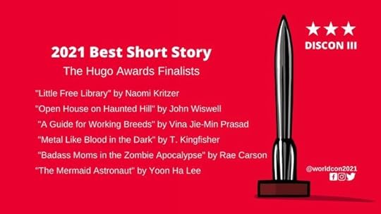 Mejor relatoBadass Moms in the Zombie Apocalypse, Rae CarsonA Guide for Working Breeds, Vina Jie-Min Prasad Little Free Library, Naomi KritzerThe Mermaid Astronaut, Yoon Ha LeeMetal Like Blood in the Dark, T. KingfisherOpen House on Haunted Hill, John WiswellEn esta categoría de los premios Hugo repiten Rae Carson, Vina Jie-Min Prasad y John Wiswell; los relatos Madres cañeras en el apocalipsis zombi, de Rae Carson, y Guía para razas trabajadoras, de Vina Jie-Min Prasad, ya se pueden leer en español en el Patreon de Crononauta, así como El nido de libros, de Naomi Kritzer, que está en español en Tor.com. Los relatos de T. Kingfisher y Yoon Ha Lee aún no los he leído, pero no por falta de ganas, ¡sino de tiempo!