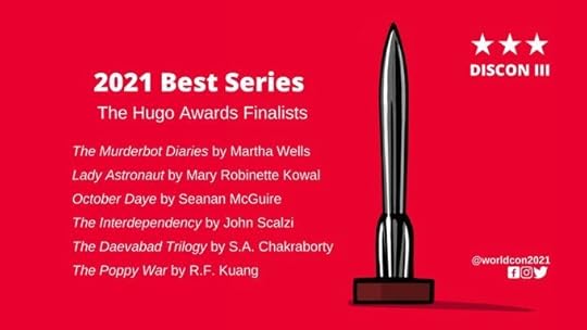 Mejor sagaThe Daevabad Trilogy, S. A. ChakrabortyThe Interdependency, John Scalzi The Lady Astronaut Universe, Mary Robinette Kowal The Murderbot Diaries, Martha WellsOctober Daye, Seanan McGuireThe Poppy War, R. F. Kuang Esta categoría no existe en los Nebula, de ahí que no tengamos una pequeña pista de lo que podría salir en los Hugo. Pero estamos de enhorabuena, porque hay sagas disponibles en español. En concreto, la de John Scalzi (Minotauro), Mary Robinette Kowal (Oz Editorial) y R. F. Kuang (Orok Editorial). Por desgracia, de Los diarios de Matabot, de Martha Wells, solo tenemos disponibles las dos primeras entregas (Sistemas críticos y Condición artificial) y no hay noticias de que La Esfera de los Libros vaya a seguir publicándola (si lo sabré yo, que las estaba traduciendo).