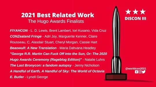 Mejor trabajo relacionado con el géneroBeowulf: A New Translation, Maria Dahvana HeadleyCoNZealand FringeFIYAHCON“George R.R. Martin Can Fuck Off Into the Sun, Or: The 2020 Hugo Awards Ceremony (Rageblog Edition)”, Natalie LuhrsA Handful of Earth, A Handful of Sky: The World of Octavia E. Butler, Lynell GeorgeThe Last Bronycon: a fandom autopsy, Jenny NicholsonEn esta categoría entra de todo, desde hilos de Twitter hasta convenciones y libros de ensayo, por lo que nunca sabes lo que te vas a encontrar. Le tengo interés sobre todo al libro de Octavia E. Butler, cómo no, pero ¿el resto? Para el resto tengo que investigar (aunque sí sé que la FIYAHCON fue un exitazo y la nueva traducción de Beowulf de Maria Dahvana Headley ha triunfado).