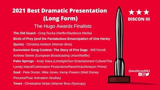 Mejor películaBirds of Prey (and the Fantabulous Emancipation of One Harley Quinn)Eurovision Song Contest: The Story of Fire SagaThe Old GuardPalm SpringsSoulTenet¡Por primera vez he visto todas las películas nominadas a los Hugo! Bueno, todas menos una (Tenet). ¿Esto significa que el cine se ha hecho más accesible por la pandemia? No lo sé, pero el caso es que tengo una clara favorita: The Old Guard. Aunque también disfruté mucho del Aves de presa y de Palm Springs.