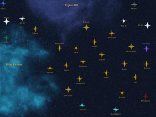 This version of the map doesn’t include the hyperbridges linking the star systems, so you don’t get the full picture of how they shape trade, travel, and politics, but their absence simplifies things. Here you can see the member systems of the Eleutherian League–my protagonist star nation–in gold along with a few minor star nations in various colors. Green for the Kingdom of Heiau. Blue for the Republic of Ithaca. Purple for the Principate of Cassowary. White denotes unclaimed star systems, while the two turquoise stars are part of the larger Republic of Nebesa, red the Algonquian Union, and gray the Goídelic Raiders.