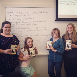 Here is the photo of several of my wonderful students: Dana Resendez, Amelia Sarkisian, Marcella Camino, and Melinda LaRochelle. We're studying your book in a senior seminar on young adult literature and all these students plan to be English teachers. In class Thursday, they came up with hypotheses about what you wanted to illustrate in your book and then identified the evidence or methods to support their hypotheses. It worked surprisingly well!