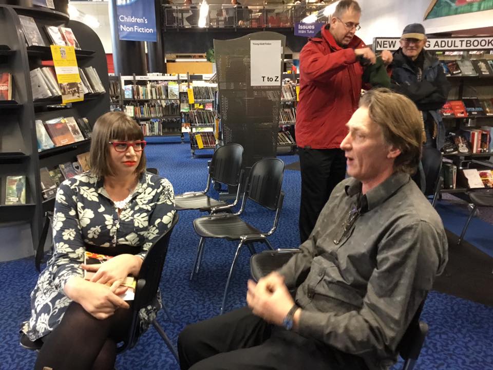 Harvey Molloy and I were both in Dunedin for a Coal Action Network Aotearoa hui this past weekend, and we took the opportunity (with the very much appreciated help of Mākaro Press, Dunedin Public Libraries and University Book Shop Otago) to have a joint poetry reading, with Bruce from the University Bookshop selling our two latest collections: