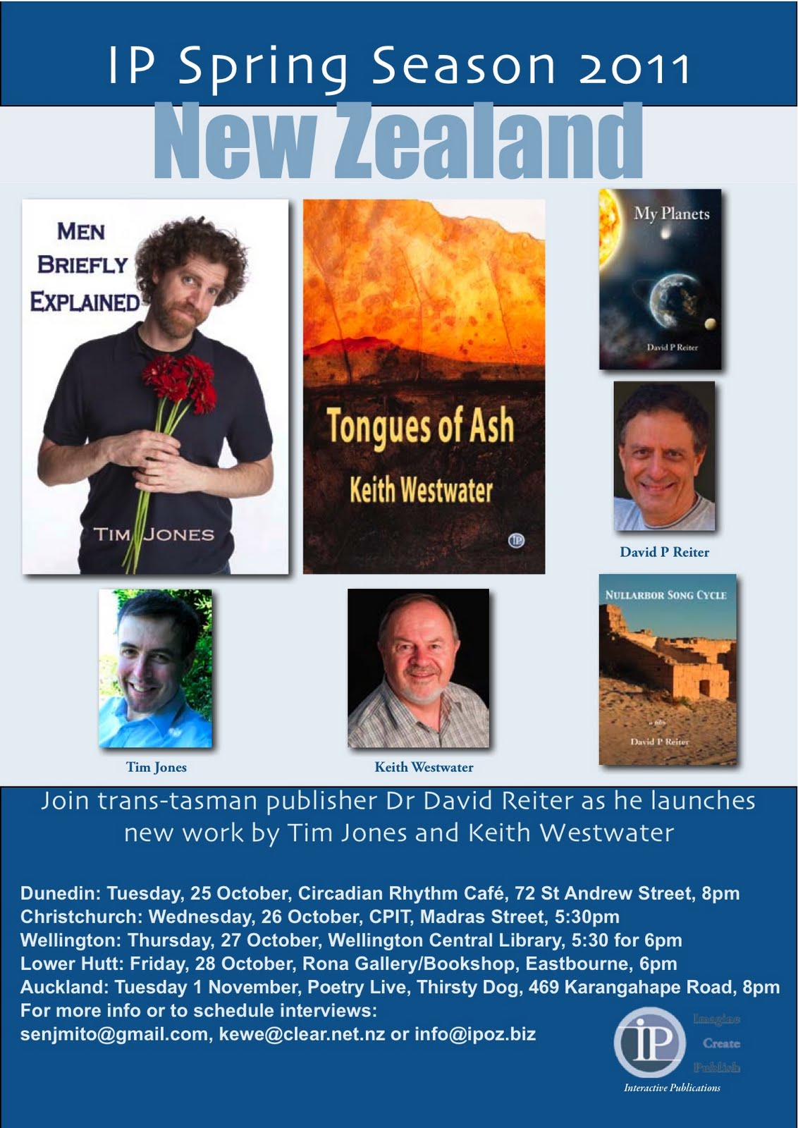 It's all on! The Interactive Press book tour for my third poetry collection, Men Briefly Explained, and Keith Westwater's prize-winning debut collection Tongues of Ash, starts in Dunedin on Tuesday 25 October and ends in Auckland on Tuesday 1 November. Here is the tour poster: