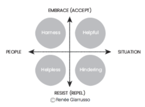 The model shows the choices we all have access to, in order to embrace or resist the experiences we go through from a people or situational perspective.