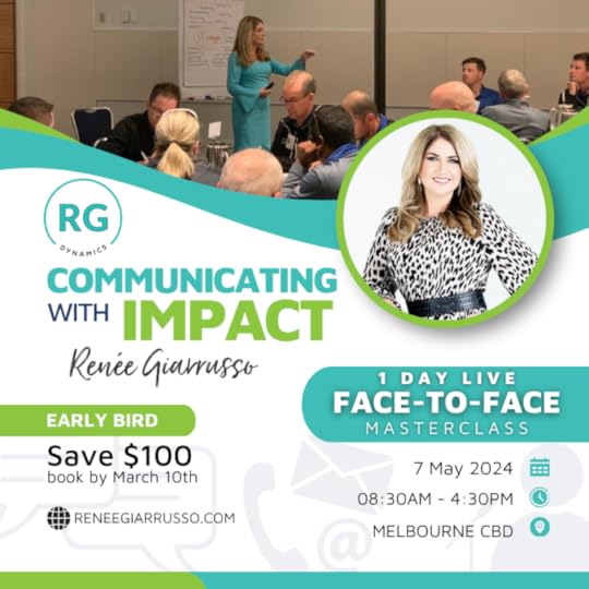 Emotional Capital Report (ECR) assessment & reportsValued at $550 alone1-day face-to-face MasterclassFacilitated by Renée GiarrussoMorning, afternoon tea and lunchWorkshop manual & all materials1hr Virtual Group check in post workshopCopy of Gift Mindset book Find out more and register here by March 22nd 2024 – Limited to 20 places Communicating with Impact1 Day LIVE Face to Face Masterclass