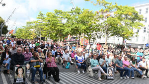 We got into Cork late on Saturday afternoonfor a session with Donnchadh Ó Laoghaire and mé féin about the hungerstrikesand books and writing and struggle and life.Go raibh maith agatDonnchadh. On Sunday morning Chris and I visited the Blarney Stone.Chris came away talking like RG. Then off to meet families of thehungerstrikers before making our way to join the walk from Kennedy Quay toGrand Parade and the National Monument.