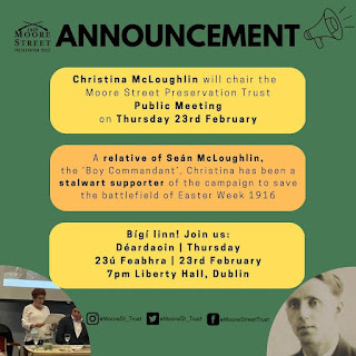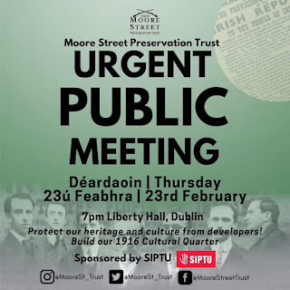 The Moore Street Preservation Trust plan to develop The 1916- Moore Street Quarter will be presented by Seán Antóin Ó Muiri at the Liberty Hall meeting.