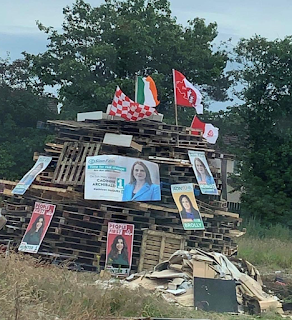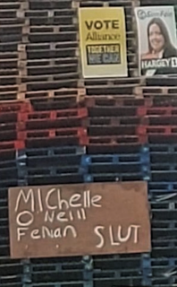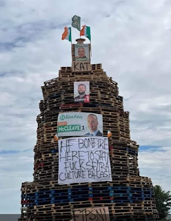 Controversy, sectarian threats and violence have long been associated with the 11 July bonfires and the marching season. ‘Kick the Pope’ bands and sectarian hate music and songs are a regular feature of many loyal order parades. This year yet again election posters of Sinn Féin, SDLP and Alliance representatives competed with each other for space on bonfires. Effigies of Mary Lou McDonald, Michelle O’Neill and Naoimi Long were hung from makeshift gallows. Sectarian, misogynistic and abusive slogans were nailed to bonfires. Among them; ‘KAT – Kill all Taigs,’ ‘All Taigs are targets’.