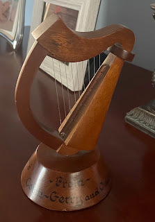 It has been sitting in my living room in NY for over twenty years. And it’s in great shape. That wee harp sat on top of our TV in Belfast for decades. We had another one that my dad won in a raffle at the PD, also in 1973, that sat beside it. Both are now here with me.’