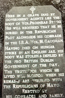 ‘Here in a grave dug by government agents lies thebody of Vol. Proinsias Stagg. His will required that he be buried in theRepublican Plot alongside his comrade in the IRA Vol. M. Gaughan. Having diedon hunger strike in an English jail his body was stolen and defiled by the proBritish Dublin government of the day. The truth for which he lived will blossomwhen his remains are reburied with the Republicans of Mayo. Erected by hisComrades and family.’