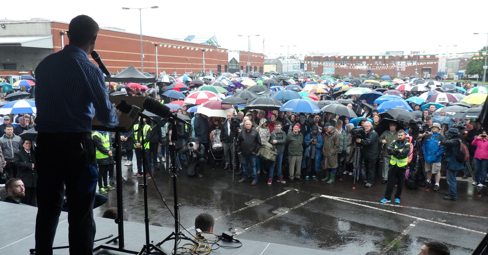 Councillor Tómas Sharkey welcomed everyone to the car park where the event was being held and Councillor Imelda Munster was an excellent chair for the proceedings. Laments were played by Patrick Martin and the last post by Harry Bellew Jr echoed across Dundalk. The Roll of Honour of all of those who died on hunger strike in the last century was read out by Shauna McKee and Niamh Morrow and Donna Lawless and Aoife Archibald read two poems by Bobby Sands.Ellen Maguire’s haunting voice carried across the huge space as she sang ‘Forever in my mind’ a song written by Christy Moore and based on a poem by Pierce McLoughlin. Ellen closed the proceedings with Amhrán na bhFiann.When I stepped forward to speak I was looking down on a sea of umbrellas. This year there were more media than usual because of the controversy around the murders of Jock Davison and Kevin McGuigan and claims by the PSNI about the IRA. Below is a transcript of my speech. While it had to address other matters it is primarily about the hunger strikers, their courage and legacy.