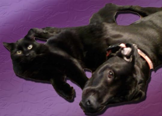 Once Mojo reached a state of independence, Zackie-O let him go his own way and gave him less attention. Puppy Angus (see picture at beginning) became Mojo’s special friend. Angus is currently 80ish pounds, has enormous feet, and forearms like Popeye the Sailor Man. Mojo likes to wrestle with him. I let them go at it until someone either yelps or yowls. They both learn interspecies manners this way and I intervene before anyone causes me vet bills.