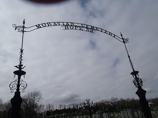 The antics of the man now became a spectator sport, and we avidly watched the action unfold. He stalked theatrically in front of the church, proclaiming all the while the failings of the bride spirit. Synchronized with the panning of the cameras, Zackie’s muzzle pointed first left and then right as the man paced back and forth. Eventually, to make her disdain plain to all, she sneezed mightily in his direction and began to circle before lying down for a nap. Just as she was really getting comfortable, the man bounded down the steps and proceeded to the far side of the church to enter an old graveyard. Forcing Zackie to her feet, we moved along the edge of the stone wall to keep the man in sight. A wrought iron gate stood in front of the cemetery. It was elaborate in the Victorian style and bore the words ‘Moravian Cemetery Hope, NJ’ in a twisted metal banner at the top.