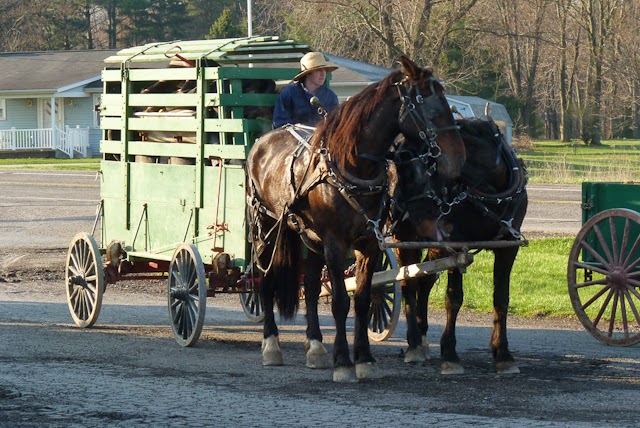 Here is a typical Old Order Amish moving van. It will be used for everything from large livestock to fine furniture, and the Schwartzentruber sect that favors this style is the most conservative of all the Amish people in Ohio. It was a rare sight to find them passing through town. Mostly the Schwartzentrubers stay close to their farms.