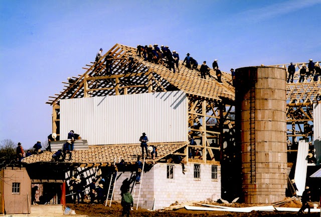 When an Amish family needs a new barn, people come from several church districts and townships to help with the task. Here the younger men are working hard in the rafters. In addition to the men you can see, there was an equal number inside the structure, building lofts and stalls. What you don't see in the picture is all the women and children in the yard beside the barn, putting together the noon meal. If you can arrange to see one of these barn raisings, I think you would be amazed by the organization and industry it takes to finish the job in a single day.