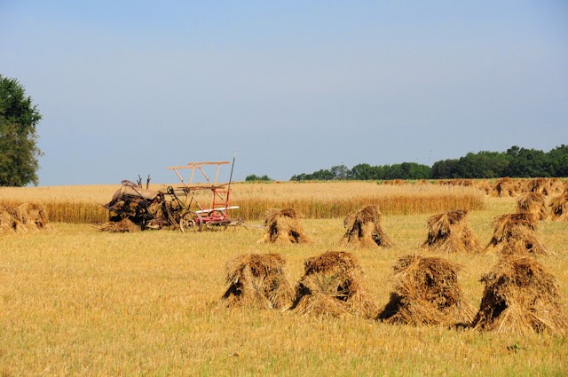 In Holmes County, it is the time of year when the wheat is harvested. Here the mower stands idle while the family stacks the wheat in shocks. It is slow and quiet work, and everyone helps with the task, even the youngest and the oldest of the families. This is a particularly large field, and the job will take several days.