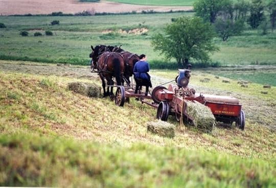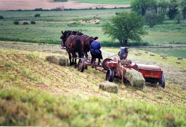 Sometimes Amish women work the fields. Here is one baling hay. Notice that the wheels of the baler are made of plain steel. That's an indication of a more conservative Amish practice. But also notice that she is not taking up the hay with a hand rake and a flat wagon. That would be the strictest, oldest order practice.