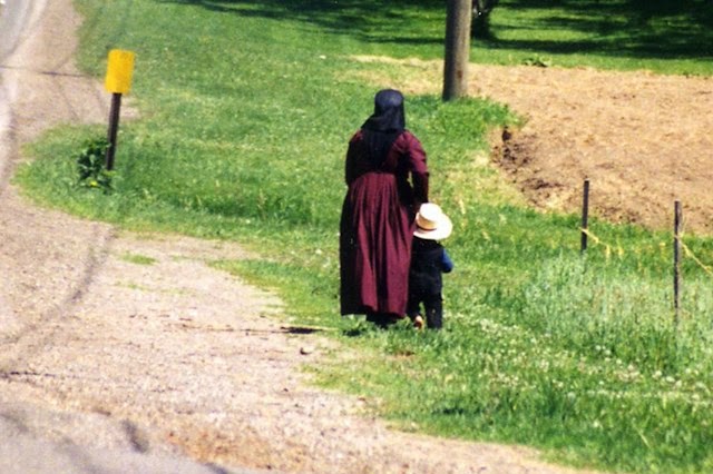 An Old Order Amish woman waits for the bus with her son. Clothes like that have got to be hot in summer.