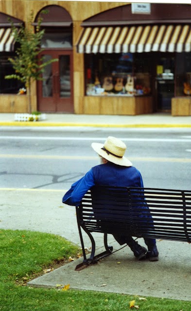 Here is Andy, a one-armed Amish man waiting on an iron bench in Millersburg. I spent the day with him several years ago, and we traveled to a number of shops in the area so that he could arrange some business for his sawmill operation. The best part about the day? Driving him around Holmes County in my Miata with the top down. Once that day he commented to me that he would like to go one hundred miles an hour. I won't say more, but the Miata can handle the speed. What would you have done?
